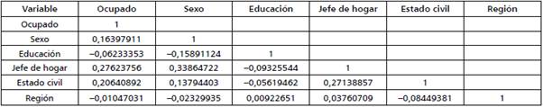 El modelo por estimar incluye cinco variables independientes: educación, género, región, jefe de hogar y unido. En primer lugar, la variable educación refiere el último título obtenido. La variable género captura el efecto de ser hombre o mujer; es una variable dummy con valores de hombre = 1 y mujer = 0. En tercer lugar, las variables región7miden el efecto de estar en una zona geográfica y la probabilidad de estar ocupado. Por último, las variables jefe de hogar y unido8son variables categóricas que muestran si estas condiciones de las personas afectan la probabilidad de ocupación.