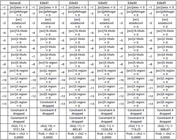 Respecto de la variable región, que analiza a cada región frente a la parte Atlántica, en el modelo general se observa que en todas disminuye la probabilidad de estar ocupados, excepto de Bogotá (sin significancia estadística). Por grupos de edad, en la región Oriental tiene un impacto negativo en los grupos 1 y 5, mientras en los demás no tienen significancia estadística. En la región Central la probabilidad de estar ocupados solo aumenta en el grupo de edad 3, mientras en el grupo 2 y 4 no es estadísticamente significativo y en los demás disminuye. La región Pacífica disminuye esta probabilidad en los grupos 1, 4 y 5, y no lo aumenta en ninguno. En el caso de Bogotá aumenta la probabilidad de estar ocupado en todos los grupos, menos en el 5, y no es estadísticamente significativa en los grupos 4 y 2.
