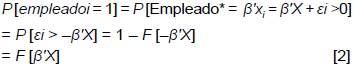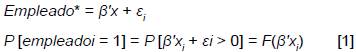 El primer modelo por estimar mide la probabilidad de estar ocupado frente a estar desempleado; por ello la variable dependiente toma valores de 1 y 0, ocupado y desempleado, respectivamente. Así, el modelo probit de empleo y empleo formal será10:
