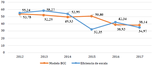 Una vez analizados los resultados anteriores, se realiza el contraste de estos con los scores medios obtenidos por la EE, medida que permite eliminar el efecto de las escalas de los resultados obtenidos a través del modelo BCC; es decir, la EE permite obtener scores de eficiencia indiferentes al tipo de escala que utilicen las DMU. Para el caso del mercado accionario colombiano para el periodo 2012-2017, se tiene que los resultados de EE presentan pocas diferencias con los scores obtenidos por medio del modelo BCC, con excepción del año 2015, por lo que se puede decir que el tipo de escala de las empresas no es determinante en el resultado de eficiencia obtenido, si se tiene en cuenta la particularidad de dicho año, cuando la diferencia existente entre los resultados evidencia que al eliminar el efecto de las escalas se observa una desmejora considerable en la eficiencia conjunta (Gráfica 1).