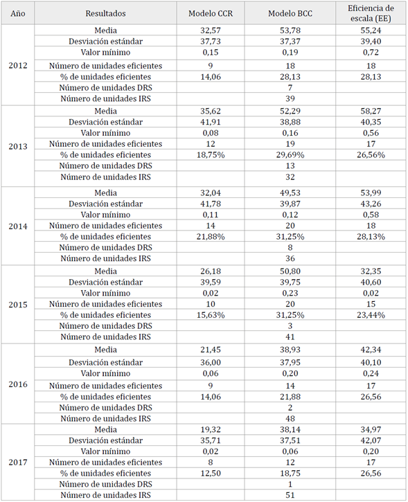Los resultados arrojan que, durante el periodo 2012-2017, se presentaron en promedio por año 17 unidades eficientes bajo el modelo BCC, que representan el 26,82% del total de las empresas cotizantes en el mercado accionario colombiano. Se identifica, además, una tendencia creciente durante los primeros años (2012-2015), siendo 2014 y 2015 periodos en los que se presentaron más unidades eficientes, ambos con 20, que representan el 31,25% del total de DMU; en el 2016 se rompe esta tendencia, y salen del grupo de empresas eficientes algunas organizaciones que habían sido referente durante los primeros años, como la Bolsa Mercantil de Colombia S.A., la Bolsa de Valores de Colombia S.A., el Banco Bilbao Vizcaya Argentaria Colombia S.A., el Fondo Ganadero del Tolima S.A. y la Compañía Agrícola San Felipe S.A.; por lo tanto, se pasa a 14 DMU eficientes hasta llegar al año 2017, cuando se da la menor cantidad de empresas eficientes, con 12, que representan el 18,75% de las organizaciones evaluadas. Además, se debe anotar que 6 empresas fueron eficientes durante todo el periodo de análisis (2012-2017), a saber: Avianca Holdings S.A., Biomax Biocombustibles S.A., Cemex Latam Holdings S.A., Coomeva Entidad Promotora de Salud S.A., Ecopetrol S.A. y Organización Terpel S.A.