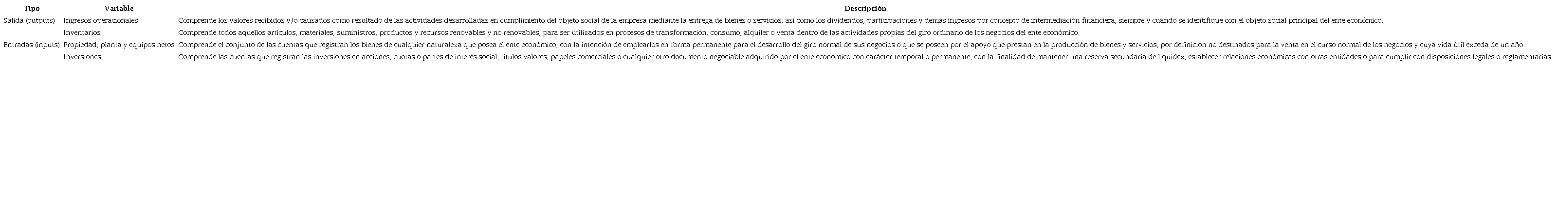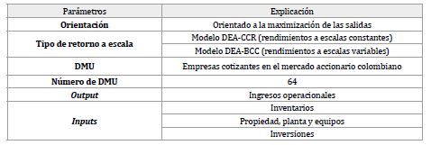 El modelo tiene una función productiva que contempla tres variables de entradas (inputs): Inventarios, Propiedad, planta y equipos netos e Inversiones; y una variable de salida (output): Ingresos operacionales. Los inputs y outputs considerados para el modelo corresponden a los usualmente considerados en la literatura para la evaluación de la eficiencia en el ámbito financiero, como se observa en los trabajos de Edirisinghe y Zhang (2007, 2008) y Frijns et al. (2012) en el contexto internacional; y de Fontalvo et al. (2015) en el contexto nacional. En la Tabla 1 se muestra la descripción de cada una de las variables de la función productiva.