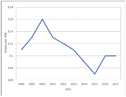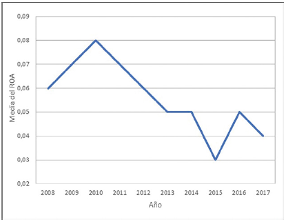De los resultados y de la figura 1, se evidencia que desde 2008 hasta 2010 hubo un aumento desde 0,06 hasta 0,08. Desde el año 2010 y hasta el 2015 el indicador ROA medio fue decreciendo desde 0,08 hasta llegar a 0,03. A partir del 2015, el indicador vuelve a incrementar su valor, alcanzando un 0,05 en el 2016, y se exhibe una disminución durante el 2017.