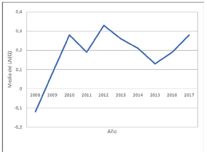 Finalmente, en la Figura 3 se presenta la variable LN (Q de Tobin). Se observa que a partir del 2009 se mantiene alrededor de la media, excepto en el 2008, cuyo valor era negativo (ln(q) (2008)= -0,12), indicando un valor real q(2008)= 0,88.