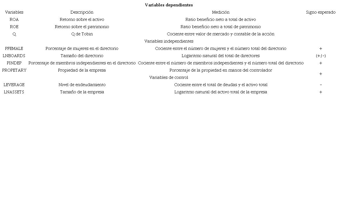 Estudios previos han estudiado la relación entre la diversidad del directorio y el desempeño, utilizando como variables explicativas las medidas contables ROA y ROE y el valor de la empresa medido por el Q de Tobin. Shrader, Blackburn e Iles (1997) investigan la relación entre el porcentaje de mujeres miembros del directorio y las medidas contables ROA y ROE; sus resultados muestran una relación negativa significativa en algunos años de su estudio. Carter et al. (2003) analizaron la relación entre la Q de Tobin y la presencia de mujeres en los directorios para una muestra de empresas, y sus resultados presentan una relación positiva estadísticamente significativa.