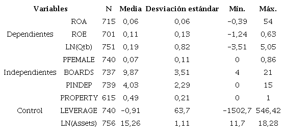 Las estadísticas de las variables presentados en la Tabla 3 muestran que los retornos ROA y ROE tienen valores similares. Se puede observar que el ROA y el ROE promedio de las empresas de la muestra son de 0,06 y 0,11, respectivamente. Respecto al porcentaje de mujeres del CA (PFEMALE), tuvo una media de un 7% (rango 0%-86%), siendo bastante heterogénea; respecto a la cantidad de miembros de directorio, se registró una media de 9,87 miembros (con un rango entre 4 y 21); y luego, el porcentaje de directores independientes (PINDEP) tuvo una media de 4,03%. El nivel medio de endeudamiento se registró en -0,91, con una alta heterogeneidad; contrariamente, el tamaño del activo de la empresa en logaritmos LN (Assets) presenta una baja variabilidad.