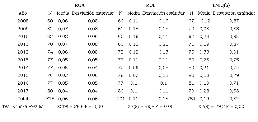 La Tabla 4 resume las estadísticas por año para las variables dependientes. Se ha añadido una prueba no-paramétrica de comparación de grupos (Kruskal-Wallis) para determinar si existen globalmente diferencias estadísticamente significativas entre los años.
