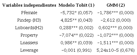 El modelo propuesto presenta el Q de Tobin como efecto de cuatro variables independientes (pfem, p¡ndep, Inboards y property), dos variables de control (lnassets y leverage) y un término de error aleatorio. Los resultados del modelo de Q de Tobin resuelto por mínimos cuadrados ordinarios (OLS, por su sigla en inglés) y por el método generalizado de momento (GMM) se presentan en la Tabla 5 (las probabilidades se presentan entre paréntesis en la tabla).