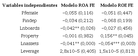 La Tabla 6 presenta los resultados de los modelos (2) y (3) con las variables ROA y ROE resueltas por el modelo de efecto fijo.