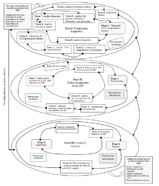 Fase II: Perfeccionamiento de la gestión económico-financiera. Esta fase consiste en desarrollar métodos y herramientas para lograr el perfeccionamiento de la gestión económico-financiera, que deberá ser diseñado con suficiente elasticidad para aceptar información, valorarla, cambiar datos y presentación razonable, de modo que al introducir nuevas variables valoradas en NIIF, no se limite; al contrario, responderá a las exigencias de los principios contables de corte internacional y a la gestión de servicios de las empresas. Esta fase está compuesta de dos etapas y cinco tareas como aporte al proceso de perfeccionamiento de las actividades de las empresas. Además, se observan aspectos como beneficio recibido y simplicidad de uso. Sin embargo, el estudio se centra en articular la NIIF a los procesos operacionales para el perfeccionamiento de la gestión económico-financiera.