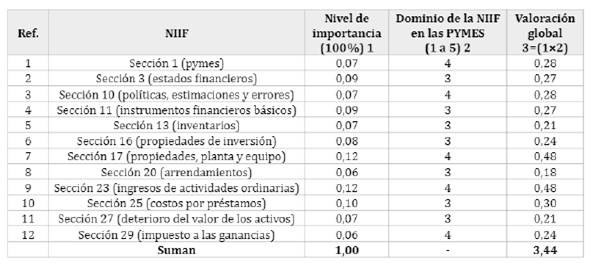 Para determinar el nivel de prioridad e importancia entre las secciones de la NIIF y los procesos que viabilizan la relación con la utilización de la NIIF, se instituye una comparación entre la aplicación de una matriz de relación en la que los expertos proporcionan valores de 1 a 5; por lo que consideran niveles de relación 1 (muy bajo), 2 (bajo), 3 (medio), 4 (elevado) y 5 (muy elevado); fórmulas que se relacionan 1-2 y 3.