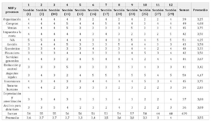 Se comprueba que las secciones de la NIIF con menor nivel de articulación son: la sección 13 (inventarios), con un promedio de 3,3, lo que representa el 66% respecto al global; la sección 16 (propiedades de inversión), con un promedio de 3,4, representado en 68%; la sección 25 (costo por préstamos), con promedio de 3,3, con representación de 66%; y la sección 27 (deterioro del valor de los activos), con promedio de 3, lo que responde el 60% estimado con relación al nivel máximo, tal como se muestra en la tabla 2. Sin embargo, las otras secciones de la NIIF muestran resultados positivos incluso mayores al promedio global; asimismo, es importante mencionar que las operaciones con mayor articulación entre los procesos operacionales y la NIIF corresponden a compras con una participación promedio de 4,08, lo que representa el 114,93% sobre el promedio general; las ventas, con una participación promedio de 3,75, representado en 105,63%; el IVA, con un promedio de 4,25, lo que equivale a 119,72%; las inversiones, con un promedio de 3,75, representado en 105,63% respecto al promedio global; otros procesos operacionales registran también índices positivos, como en el caso de servicios generales y aspectos legales, entre otros.