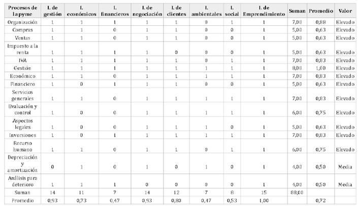 Teniendo en cuenta los resultados presentados, el índice de funcionalidad de los indicadores en los procesos de las pymes son de [0,72 + 4,66] = 5,38, lo que significa una integración funcional de los indicadores muy fuerte o elevado en los procesos de las empresas; es decir, todos los procesos en las pymes son valorados, con lo que se comprueba una relación fuerte de los indicadores en la gestión económico-financiera.