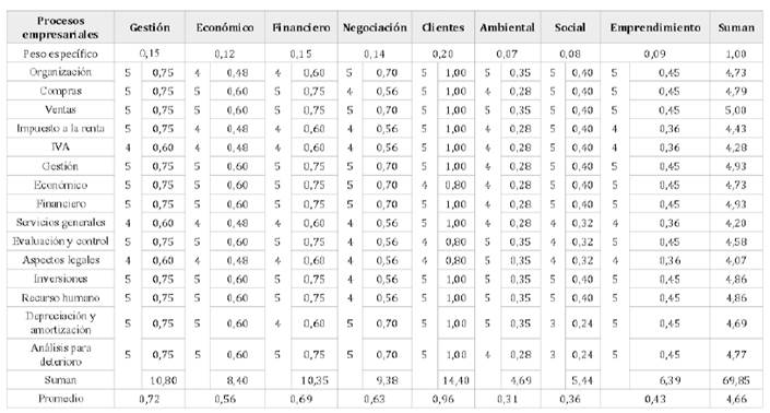 Los procesos que se integran con mayor peso en la eficiencia de los indicadores son: organización, compras, ventas, gestión, económico, financiero, inversiones, recurso humano y análisis para deterioro, lo que representa el 4,84% del promedio máximo. Los argumentos de depreciación y amortización clasifican con evaluación media.