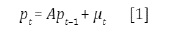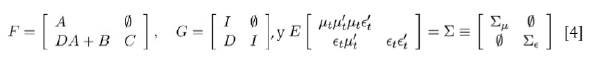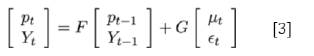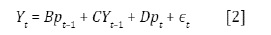 Donde εt es un término de error con media 0 y matriz de varianza covarianzas Σ. Nótese que como los precios los commodities (pt ) son incluidos en forma contemporánea en el lado derecho de la ecuación [2], los términos εt y μt son independientes. Combinando las ecuaciones [1] y [2] para [ptYt], se obtiene la siguiente representación autorregresiva: