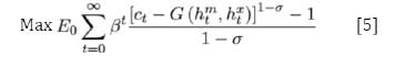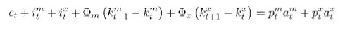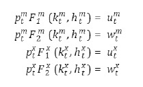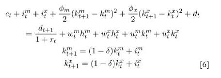 En la ecuación [5], β es el factor de descuento, ct es el consumo del bien final, htm,x son las horas trabajas en el sector importable (m) y exportable , siendo las elasticidades sectoriales de la oferta de trabajo. En el sistema de restricciones [6], itm,x es la inversión en cada sector, øm,x son coeficientes para los costos de ajuste de la inversión sectorial, ktm,x es el capital, del nivel de deuda, wtm,xy utm,x son los salarios y renta del capital y δ es la depreciación del capital.
