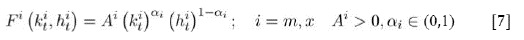 Los bienes importables y exportables son producidos mediante una tecnología de producción Cobb-Doublas como la siguiente: