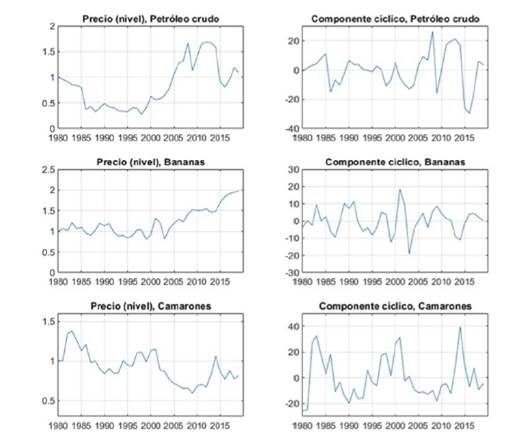 El panel de la izquierda de la gráfica 1 muestra los precios reales del petróleo crudo, bananas y camarones, normalizados usando 1980 = 1. Los tres precios comparten algunas características comunes. Entre 1980 y 1990, los precios del petróleo y camarones experimentaron caídas de aproximadamente un 50%, mientras que los precios de las bananas permanecieron relativamente estables. Desde 1990 y hasta el 2000, los precios de los tres commodities permanecieron estables. A partir del 2000 y hasta 2013, los precios del petróleo crecieron casi en forma ininterrumpida, a excepción de la crisis mundial de 2008, cuando aumentó su valor por un factor de 3. Las bananas, desde 2000, vivieron un crecimiento estable que llevó a duplicar su precio a finales de 2019. El precio de los camarones tuvo un comportamiento más errático: durante la década del 2000, los precios cayeron ininterrumpidamente hasta situarse en alrededor del 50% de su valor inicial. Entre el 2010 y el 2019 experimentaron una recuperación, pero aún es bajo su nivel inicial.