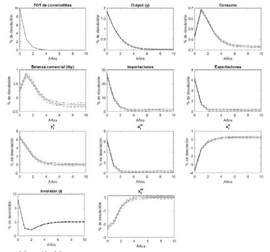 La gráfica 2 muestra las funciones de impulso respuesta de las variables macroeconômicas domésticas y de algunas variables seleccionadas desde el modelo MX, a un shock de 10% en ctot2t,, El aumento del precio delas exportaciones, inducido por el shock a los ctot2t vuelve más atractiva la producción de bienes exportables (ytx) en 6% y menos atractiva la de importables (ymt) en más de 2%, respecto del nivel de estado estacionario. Similarmente, cae el consumo de bien exportable (axt) y aumenta el de bien importable (atm) para la producción del bien final; este incremento de las exportaciones e importaciones se traduce en un alza contemporánea de la balanza comercial del 0,5% y en un incremento entre 0,5% y 1,0% en el periodo siguiente, para luego retornar a su nivel de estado estacionario a partir del tercer periodo. El shock a los ctot2t también produce un efecto riqueza, elevando el output, el consumo con un rezago y la inversión. Esta última variable presenta un fuerte crecimiento en el primer periodo, pero luego cae y comienza a retornar a su estado estacionario a partir del periodo tres; este efecto puede ser explicado por un incremento de la inversión en exportables y la reducción de esta en importables.