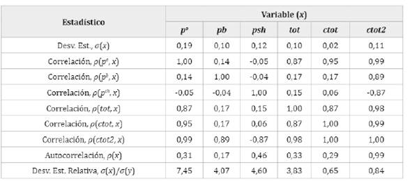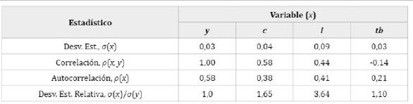 Las tablas 1 y 2 presentan los segundos momentos de las variables domésticas y de los precios y términos de intercambio, respectivamente. En línea con lo esperado, el consumo (c) y la inversión (¡) son procíclicos al output, con correlaciones de 0,58 y 0,44, y la balanza comercial (tb) es tv con correlación negativa de -0,14. El c y tb son 65% y 10% más volátiles que el output, mientras que i se presenta como el componente de mayor volatilidad (264%).