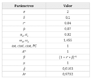 Los valores de los parámetros comunes en la literatura para modelos de un único bien (3) fueron tomados desde Uribe y Schmitt-Grohé (2017) y se encuentran disponibles en la tabla Al en anexos.