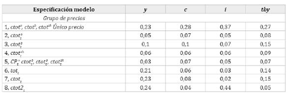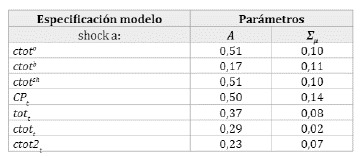 Los resultados anteriores están en línea con los hallazgos reportados por Fernández et al. (2017) y Blanchard y Galí (2011) (para precios del petróleo); sin embargo, es importante notar que si bien tott, ctotty ctot2t explican una proporción menor de las volatilidades de las variables agregadas en relación con el SVAR que incorpora simultáneamente ctot°t, ctotbty ctotsht (a excepción dey en los tres casos e ¡ para ctot2), son mejores "representantes" que los precios delas filas 2-5 en modelos SVAR con shocks sobre un único precio mundial.
