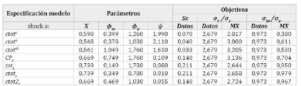 Los parámetros AR(1) son siempre positivos y señalan una mayor persistencia del proceso autorregresivo en ctot0t, ctottshy CPt. La tabla 5 muestra la calibración de la proporción de bien importable en la producción del bien final (X), los costos de ajuste de la inversión en los sectores importable (øm) y exportable (øx) y la elasticidad de tasa de interés a la deuda (Ψ). El valor del parámetro X fue calculado para matchear el promedio de la cuota de exportaciones de cada commodity en el PIB de Ecuador (sx) Para el componente principal (CPt) y ctot2tX fue calculado de manera de matchear la suma de las sx para los tres commodities, en tanto que para totty ctott se utilizó el valor de sx propuesto por Uribe y Schmitt-Grohé (2017) para una muestra de 51 países. Por su parte, øm, øxy Ψ se calibraron para matchear las volatilidades de la inversión y de la balanza comercial en relación al output (σi/ σyy σtb/σy) en el modelo y los datos.