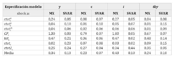 Anteriormente, desde las estimaciones del SVAR (tabla 3) se obtuvo que al menos a nivel de output, las especificaciones que utilizan como único precio mundial los tott, ctott y ctot2t representan un mejor grado de ajuste al porcentaje de la varianza explicada por el modelo que incorpora simultáneamente los términos de intercambio de cada commodity (modelo benchmark). La tabla 7 reproduce los resultados del modelo benchmark e incorpora las estimaciones del modelo MX para tott, ctott y ctot2t.