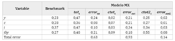 Como se aprecia, de las tres especificaciones del modelo MX, aquella que considera los términos de intercambio del petróleo, bananas y camarones (ctot2t ) como única fuente de shocks internacionales presenta el menor error, entendiendo como error a la suma de las distancias absolutas respecto de los resultados del modelo benchmark. En concreto, el error total cuando el único precio mundial es ctot2t (0,14) equivale al 15,1% del error de la especificación ctott y 22,2% del error dela especificación tott. Esto sugiere que una medida más representativa del comercio real de un país podría potencialmente explicar en mejor forma el comportamiento de los ciclos económicos.