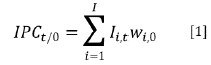Donde f es el subíndice que representa a cada uno de los bienes y servicios, IPCt/0 es el índice de precios del consumo en el periodo t, con base en el periodo 0, Iit .es el índice de precios del producto í en el periodo t, y w.i,0 es la ponderación del producto i en el mes base (periodo 0). Nótese que -además de medir las variaciones de los precios a nivel del consumidor-, el IPC se utiliza para calcular el poder adquisitivo de la moneda, calcular el índice de salario real y sirve como deflactor de las cuentas nacionales.