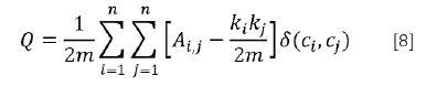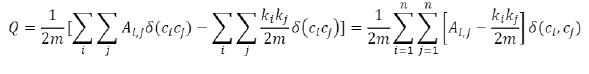 es el valor total de los enlaces en la red; c. es la comunidad del nodo i; y δ(ci, cj) es la delta de Kronecker: la cual vale 1 si ci = cjy 0 en caso contrario. Una derivación matemática de la intuición que está detrás de esta expresión se encuentra en el Anexo A.4.