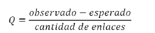 La modularidad es, en realidad, el cociente entre la cantidad de enlaces que se dan dentro de las comunidades menos la cantidad esperada bajo independencia, dividido el total de enlaces en la red: