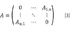 Un grafo puede ser representado a partir de una matriz de adyacencia Anxm (ecuación [3]), donde el elemento Ai,j, representa el enlace que une al nodo í con el j. En el caso de que dos nodos no estén conectados, se indica con un 0 en la matriz de adyacencia, por lo que Ai,j. = 0 ⇔ {i,j} ∉ E; los valores diferentes a 0 implican que existe un enlace entre ambos nodos, y el elemento Ai,j de la matriz nos da la intensidad de dicho vínculo. En este trabajo se utilizan redes no dirigidas, esto quiere decir que la relación entre el nodo i y el nodo j es la misma que la relación entre el nodo j y el nodo z; y sin autobucles, esto quiere decir que no existe relación del nodo i consigo mismo. En términos de la matriz de adyacencia, estas condiciones pueden expresarse como Ai,j. = Ai,jy Ai,j= 0, respectivamente, por lo que la matriz de adyacencia será una matriz simétrica con la diagonal principal nula.