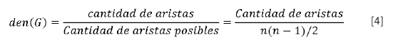 La densidad de la red G, denotado den[G) (ecuación [4]), representa el grado de conectividad entre los nodos de la red. Toma valores entre 0 y 1, siendo 0 una red donde no existen conexiones entre los distintos nodos y 1 donde todos los nodos están conectados entre sí. Se define como el cociente entre la cantidad de aristas existentes y la cantidad máxima de aristas posibles, donde, para el caso de una red no dirigida y sin autobucles con n nodos, es de n(n - 1)/2.