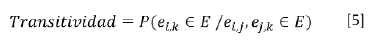 Este indicador busca cuantificar qué tan cierto es que si el nodo i está relacionado con el j, y el j con el k, esto implica que el nodo ¡ está relacionado con el k. En términos precisos, podemos dar la siguiente definición: dados tres nodos i,j y k, donde ei,jЄ E y ej,k Є E, una transitividad de 1 implica que necesariamente ej,k Є E, mientras una transitividad de 0 implica que ej,k ∉ E. En particular, este indicador (ecuación [5]) se puede interpretar como la probabilidad de que ej,k Є E, dado que ei,j Є E y ej,k Є E.