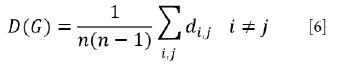 La distancia entre dos nodos dentro de una red se define como la longitud del camino más corto que une a dichos nodos. La distancia promedio de la red G, denotado D(G) (ecuación [6]), es la distancia promedio entre dos nodos cualesquiera. Permite cuantificar qué tan rápido fluye la información dentro de la red y para su cálculo no se tiene en cuenta el peso de las aristas, es decir, .