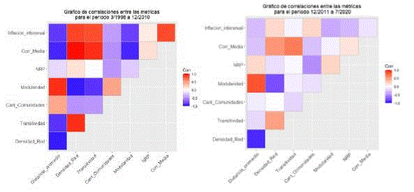 La figura 2 muestra las correlaciones entre los diferentes indicadores seleccionados y la inflación interanual, donde el color rojo está asociado con correlaciones altas y positivas, el azul con altas y negativas, y el blanco con correlaciones débiles. Con respecto al primer periodo, en términos generales se observa que la inflación interanual presenta correlaciones fuertes con varios indicadores de la red. En particular, la inflación interanual registra una correlación alta y positiva con la densidad de la red, la transitividad y la correlación media, mientras que presenta una correlación alta y negativa con la distancia promedio y la modularidad.
