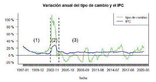 Dado que Uruguay es una economía pequeña y abierta, es esperable que el tipo de cambio nominal sea una variable relevante en la determinación de precios, y dada la creciente integración económica, se espera que aumentos del tipo de cambio sean cada vez más influyentes. De hecho, Licandro (2000) estima que un aumento de un 1% en el tipo de cambio nominal genera un aumento de un 0,83% en el IPC. En otro trabajo, Zacheo y Güenaga (2019) constatan que la magnitud del impacto de una devaluación en los precios se encuentra vinculada con las expectativas de los agentes económicos con respecto a la credibilidad de las metas de inflación. El estudio evidencia una reacción más fuerte ante shocks del tipo de cambio cuando las expectativas están desalineadas.