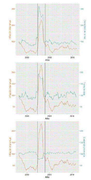 Al analizar el periodo de crisis, parece observarse en la figura 4 que la inflación interanual estaría fuertemente vinculada con lo que sucede dentro de las redes, y se nota una alta correlación entre los distintos indicadores y la inflación. En cambio, en los periodos de estabilidad no se observa una relación tan intensa entre los indicadores y la inflación, aunque en líneas generales se observa una mayor correlación para el periodo poscrisis. Esto podría indicar que los efectos de la crisis tuvieron un impacto en la estructura de las redes.