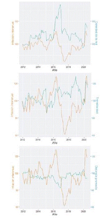 Al considerarse el último periodo de los datos (2011 en adelante), se tiene que las correlaciones son más débiles (figuras 2 y 5) que antes y se constatan cambios en el sentido de la correlación entre algunos indicadores y la inflación. Esto podría deberse a que estamos enmarcados en un periodo de inflación estable (similar a los periodos de pre- y poscrisis), por lo cual se mantienen los resultados de correlaciones débiles ante inflaciones bajas.