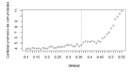 Con estos fines, se evaluó un conjunto de indicadores para las 8 redes obtenidas, y luego se procedió a sintetizar esa información calculando el promedio de dichos indicadores en los 8 años para cada valor del umbral. En particular, se puede ver que el valor de u = 0,36 parecería ser un punto de inflexión con respecto a la cantidad de comunidades que se halla en promedio para cada año (figura 6), lo que indicaría que, de presionarse el valor del umbral más hacia arriba, el número de comunidades obtenidas empezaría a tener un comportamiento errático que dificultaría el análisis que se busca realizar.
