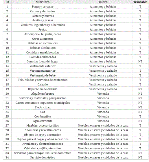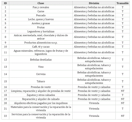 La categorizadon en transables/no transables se realizó revisando antecedentes previos, para luego proceder a clasificar cada subrubro o clase de forma ad hoc, con base en criterios económicos.