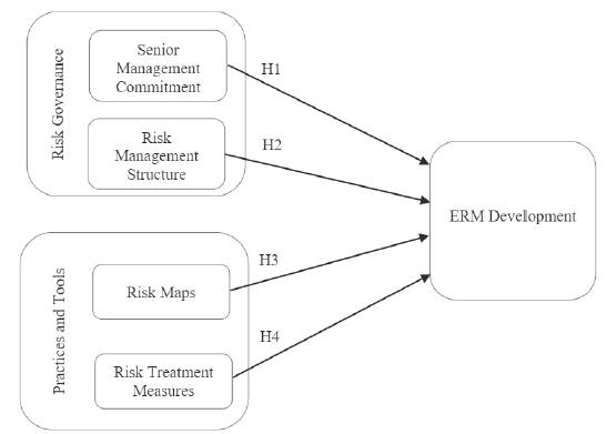 According to the previously described criteria included in the framework of an ERM system, measured by existing maturity models, when a company has rigorously applied these criteria, the level of risk management implementation can be considered as high (Marsh & RIMS, 2018; Zhao et al., 2015). The above mentioned four hypotheses are summarized in Figure 1.
