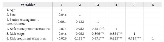 Risk management structure. This factor is measured by using four questions on a 5-point scale identifying whether the organization had an office coordinating risk management, carried out an independent system evaluation, defined responsibilities, or followed international standards (FERMA, 2012). This factor presented a KMO value = 0.717, Bartlett's test of sphericity with p<0.01, and Cronbach's alpha = 0.658, indicating internal consistency of both factors (Hair et al., 1999).