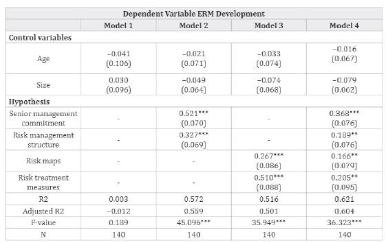 Regression Model 3 includes control variables and the independent variables of risk maps and risk treatment measures. The two control variables still have no significant correlation with ERM development. However, in the case of both independent variables, a positive and significant relationship was found with ERM development, both at a 99% confidence level QkO.01). This indicates that the companies that have created risk maps and designed treatment measures to respond to potential risks depending on the severity they represent for the company will have a positive impact on ERM development. Thus, hypotheses H3 and H4 are also acceptable since the adjusted R-squared value of this model is 0.511.