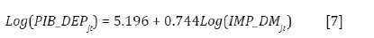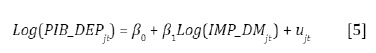 La alternativa al panel de datos, entre las diferentes posibilidades de modelación formal considerada, consistió en el planteamiento de un modelo empleando la técnica de mínimos cuadrados ordinarios (MCO), que propone una relación de causalidad en términos de identificar el efecto que tiene el aumento porcentual de los impuestos territoriales en el crecimiento económico departamental consolidado a nivel de país. Para tal efecto, el modelo planteado se define en (5) así: