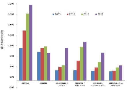 En el 2005, en conjunto, estos impuestos representaron un recaudo para las arcas de las gobernaciones de $2877 miles de millones; en 2010 ascendió a $3971 miles de millones, a $5202 en 2015, y a $6225 miles de millones en 2018, siendo el más representativo de esta canasta el impuesto a la cerveza, que ha aportado recursos significativos al sector salud, dadas sus características de constituirse como renta con destinación específica (gráfica 1). Le sigue en importancia el impuesto a los licores, aunque ha venido perdiendo representatividad durante los últimos años frente al impuesto de registro y anotación, particularmente en buena parte por efecto del contrabando de licores que ha diezmado los fiscos de estas entidades territoriales.