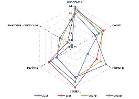 El resultado a precios corrientes estuvo representado por el comportamiento de la Amazonía-Orinoquía, que creció a un ritmo significativo de 15,6% entre los años 2018 y 2017, pero aporta pocos puntos porcentuales al crecimiento total; la región Oriental creció en 8,4%; Bogotá y la región Central, el 5,9%; y la región Pacífica lo hizo en 4,7%. Salvo los resultados de la Amazonía-Orinoquía durante el periodo (2014-2018pr), puede afirmarse que el crecimiento del PIB ha sido, en términos generales, homogéneo en todas las regiones del país (gráfica 9).