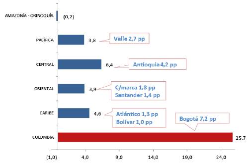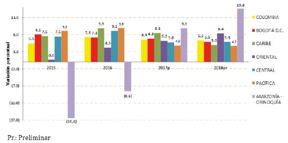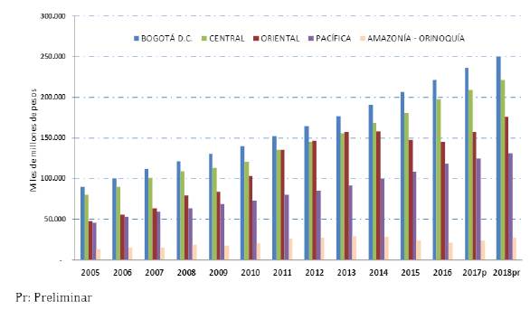 Entre los años 2015 y 2018pr, el PIB de Colombia ha crecido 25,7%; Bogotá es la región del país que más puntos ha aportado a este resultado (7,2 puntos porcentuales), seguida de la región Central (6,4 puntos porcentuales), la región Caribe (4,6 puntos porcentuales), la región Oriental (3,9 puntos porcentuales), la región Pacífica (3,8 puntos porcentuales) y la Amazonía-Orinoquía, que en conjunto aportó -0,2 puntos porcentuales al crecimiento económico.