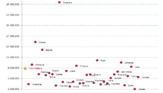 Le siguen a Bogotá, D.C, en términos del impacto económico, los departamentos de Antioquia, Santander, Valle del Cauca, Atlántico y Bolívar. Los demás departamentos no inciden de manera significativa en el crecimiento económico, pero el esfuerzo fiscal generado con la expedición de las leyes que los indujeron a controlar sus gastos y financiamiento les ha permitido promover una sana disciplina que hoy día los lleva a cubrir con esos recursos sus gastos corrientes y parte de la inversión productiva, lo que se convierte en fuente de su crecimiento económico y mejora en el bienestar de su población.